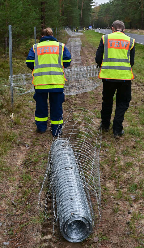 - Nur ein fester Zaun ist eine Barriere für Wildschweine. THW-Helfer beim Zaunbau in der Nähe von Krauschwitz im Kreis Görlitz. Archivbild