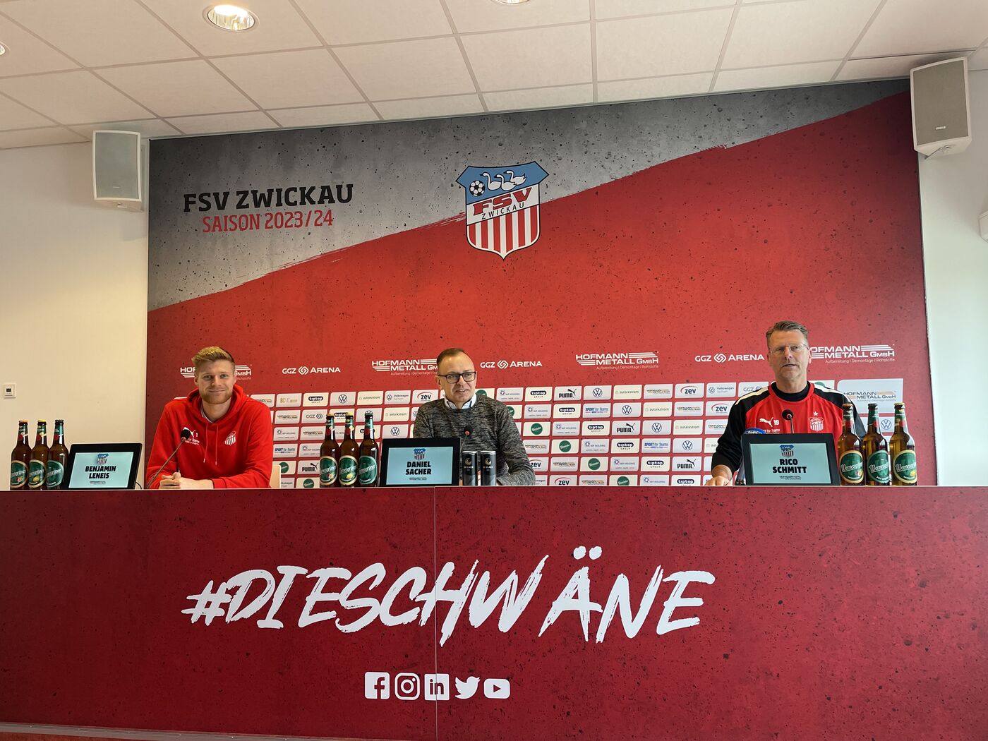 - Benjamin Leneis (v.li.) , Daniel Sacher, Rico Schmitt bei der Spieltags-Pressekonferenz