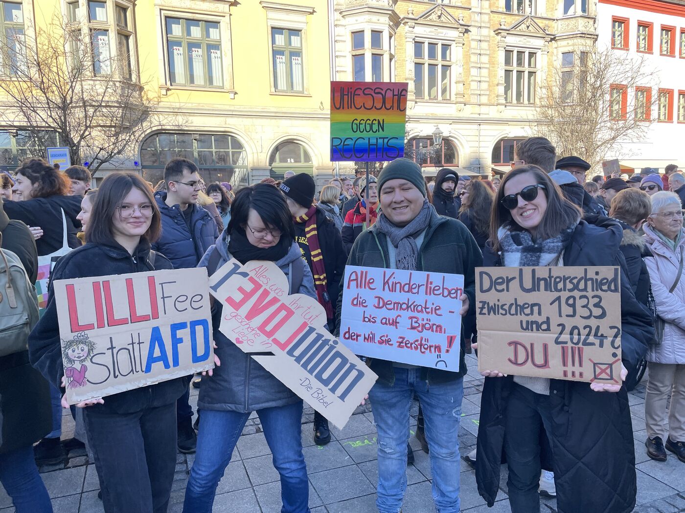 - Sie demonstrieren gegen Rechtsextremismus und für Demokratie.